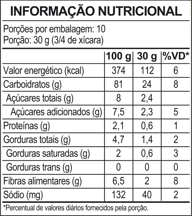 Farinha de milho orgânico, grits de milho orgânico, açúcar orgânico, extrato de malte*, gordura de palma orgânica, sal e aroma natural de baunilha*. (*) Ingredientes não orgânicos. Produto composto com mais de 95% de ingredientes orgânicos. CONTÉM GLÚTEN. ALÉRGICOS: CONTÉM DERIVADOS DE CEVADA. PODE CONTER TRIGO, CENTEIO, AVEIA, SOJA E LEITE.