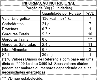INGREDIENTES: açúcar mascavo, fécula de mandioca, amido de milho, óleo vegetal de palma, gotas de chocolate meio amargo (açúcar, gordura vegetal, cacau em pó e massa de cacau), farinha de arroz, chocolate 50% cacau, sal marinho, agentes de crescimento: bicarbonato de sódio e bicarbonato de amônia, emulsificante: lecitina de girassol e goma xantana, acidulante ácido cítrico e aromas.